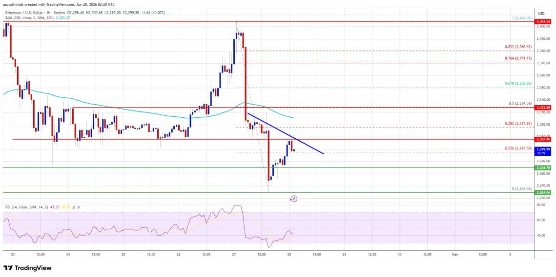اتریوم اصلاح نزولی خود را از محدوده ۲٬۴۰۰ دلار آغاز کرد. قیمت اکنون زیر ۲٬۳۵۰ دلار و پایینتر از میانگین متحرک ساده ۱۰۰ ساعته معامله میشود. همچنین در نمودار ساعتی ETH/USD، بر اساس دادههای کراکن، یک خط روند نزولی با مقاومت در سطح ۲٬۳۱۰ دلار در حال شکلگیری است. این جفتارز در صورتی میتواند افزایش تازهای را آغاز کند که بالای محدوده ۲٬۳۵۰ دلار باقی بماند.