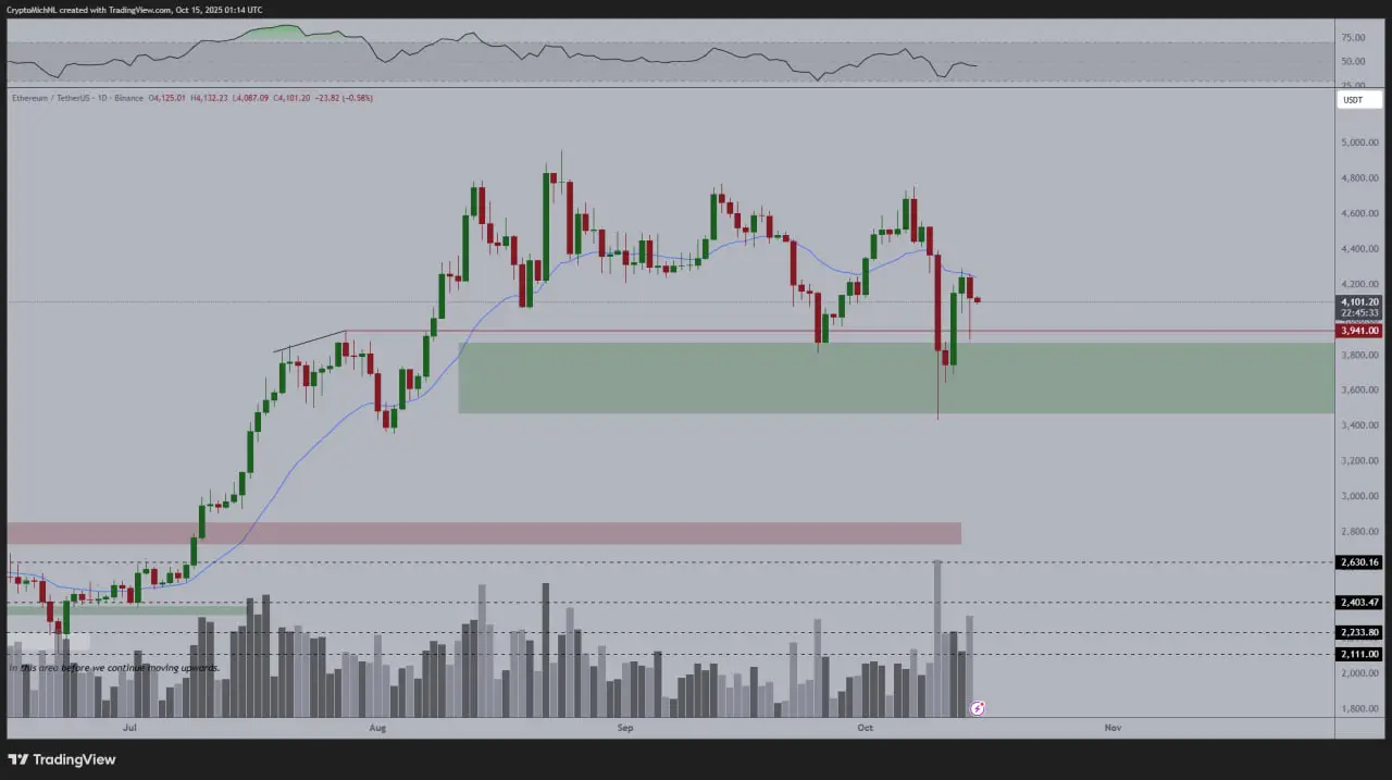نمودار او نشان میدهد که ETH در محدوده ۳۶۰۰ تا ۳۹۰۰ دلار بازگشت داشته — محدودهای که پیشتر نیز بهعنوان سطح حمایتی عمل کرده است. هماکنون اتریوم در حدود ۴۱۰۰ دلار معامله میشود و پس از اصلاح از ۴۶۰۰ دلار، حجم معاملات دوباره در حال افزایش است؛ نشانهای از بازگشت تقاضا به بازار.