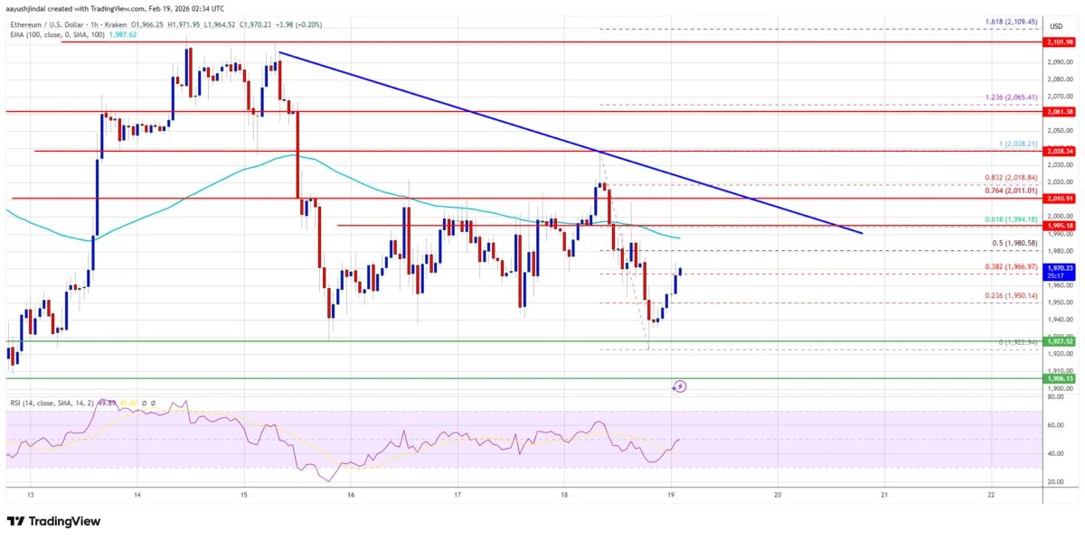 در حال حاضر قیمت زیر محدوده ۱۹۸۰ دلار و میانگین متحرک ۱۰۰ ساعته معامله میشود که نشانهای از احتیاط معاملهگران کوتاهمدت است.