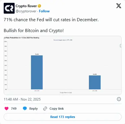 بازارهای مالی اکنون شانس بالایی برای کاهش نرخ بهره توسط فدرال رزرو در نشست ماه دسامبر قیمتگذاری میکنند. بر اساس دادههای ابزار «CME FedWatch»، احتمال کاهش ۲۵ واحد پایهای نرخ بهره به ۷۱ درصد رسیده که نسبت به ۳۰ تا ۴۰ درصد ابتدای هفته جهش قابل توجهی داشته است.