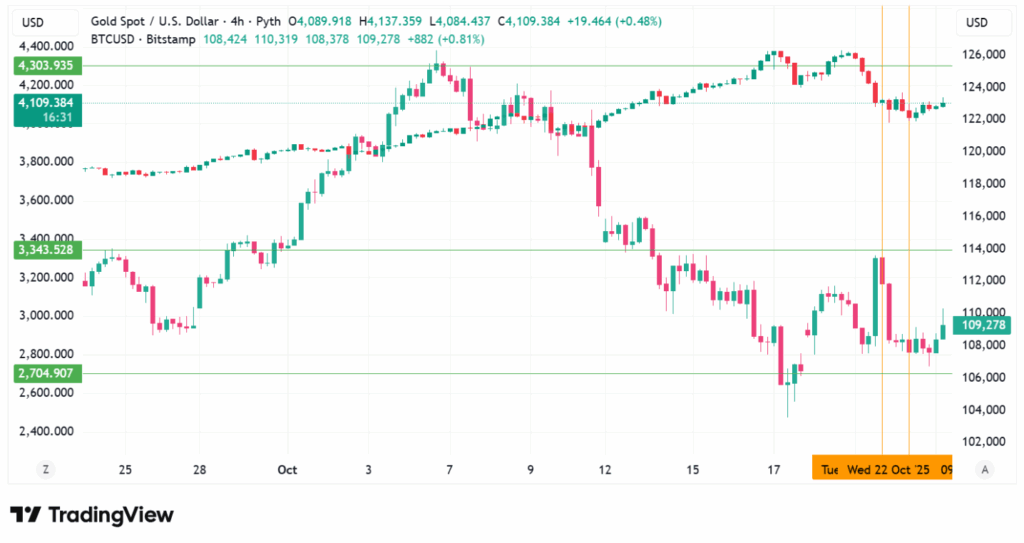 در مقابل، بیتکوین درست در همان بازه زمانی جهشی قابل توجه داشت و طی ۲۴ ساعت نزدیک به ۱٪ رشد کرد؛ حرکتی که نشاندهندهی چرخش سرمایه از داراییهای امن سنتی به داراییهای دیجیتال است.