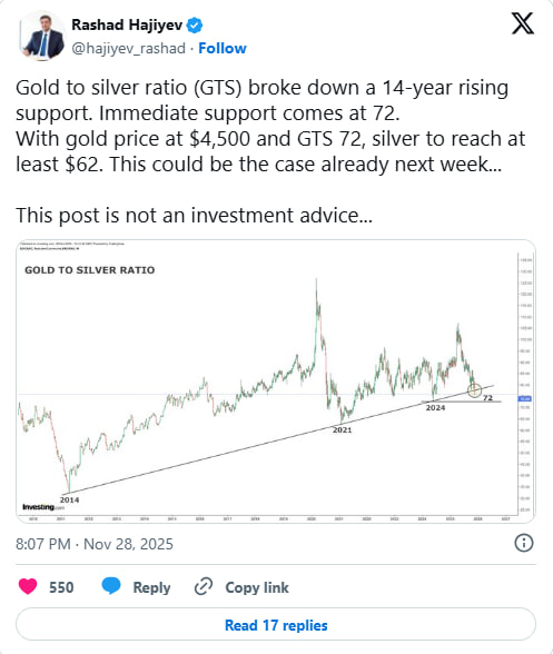 آمار اشتغال و سفارشات کالاهای بادوام نیز نشان داد فشار رکودی بر اقتصاد آمریکا نسبت به ماههای قبل محدودتر شده، اما این دادهها نتوانستند انتظار بازار برای کاهش نرخ بهره را کمرنگ کنند. در نتیجه طلا در آستانه تعطیلات شکرگزاری همچنان بالای محدوده حمایتی چهار هزار و صد دلار معامله شد.