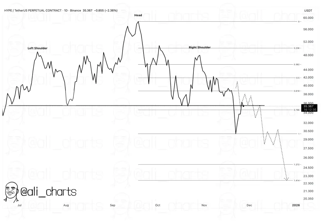 بر اساس نمودار فعلی HYPE، توکن در حال بازآزمایی یک ناحیه حمایتی ازدسترفته است که اکنون نقش مقاومت را ایفا میکند. این محدوده با ناحیه خط گردن یک الگوی احتمالی «سر و شانه» همپوشانی دارد و همین موضوع احتیاط بیشتری ایجاد میکند. این بازآزمایی همچنین با محدودههای اصلاحی فیبوناچی ۰.۶۱۸ تا ۰.۷۸۶ همراستا است؛ منطقهای که معمولاً برای رد قیمت زیر نظر قرار میگیرد.