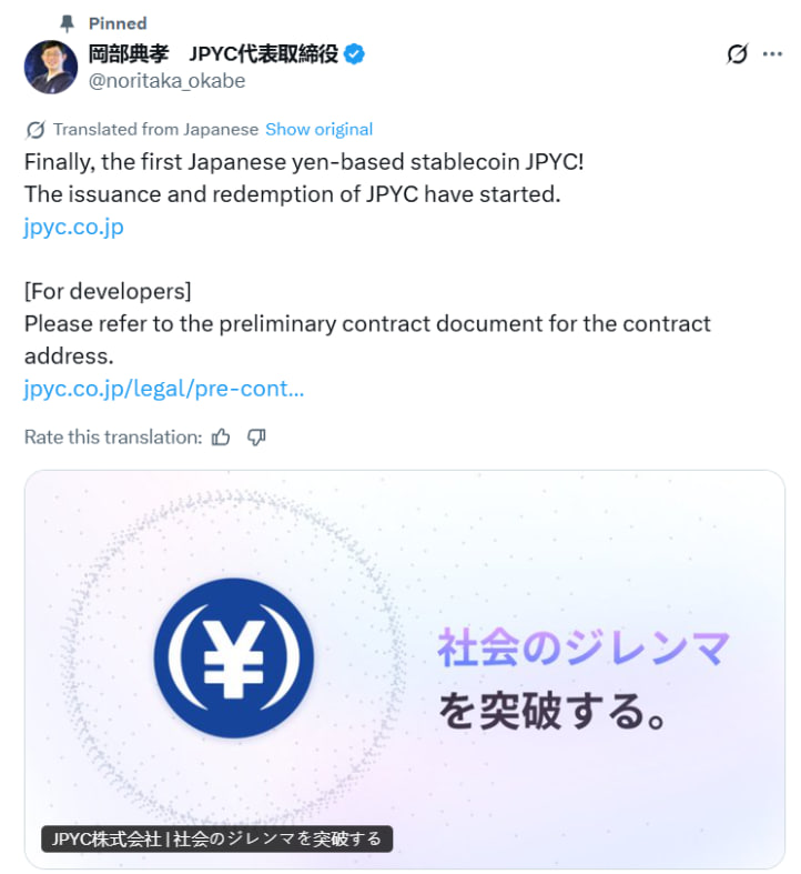 JPYC روز دوشنبه کوین جدید خود را بهطور رسمی معرفی کرد. پشتوانه این استیبلکوین، سپردههای بانکی و اوراق دولتی است و ارزش آن دقیقاً معادل ین است. نوریوشی اوکابه، رئیس JPYC، این حرکت را «یک نقطه عطف در تاریخ پول ژاپن» توصیف کرد.
