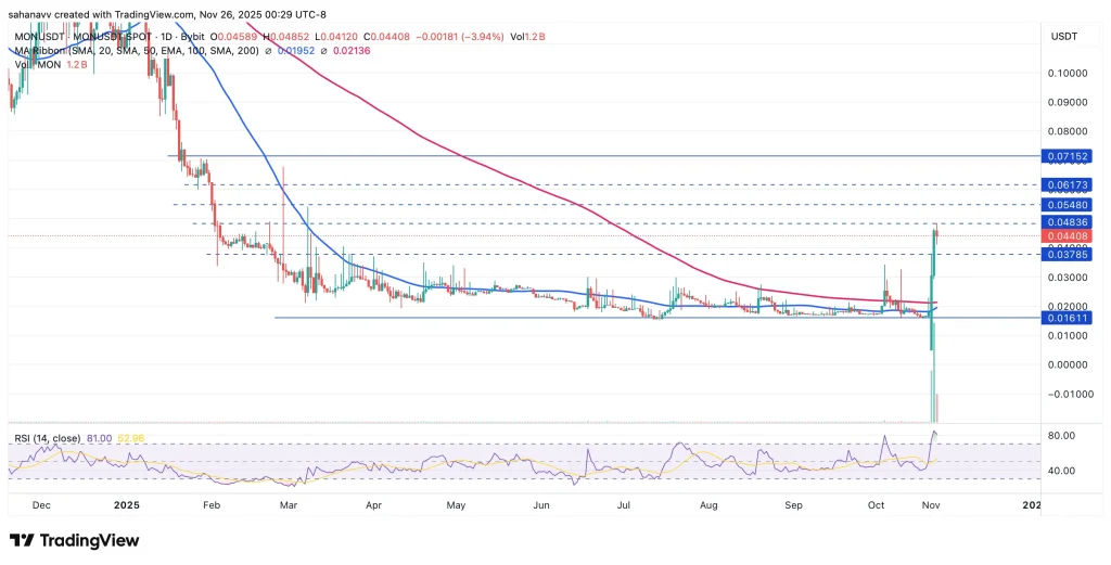 MON برای اولین بار امسال میانگین متحرک ۲۰۰ روزه را پس گرفته است؛ اتفاقی که معمولاً نشانه شروع روند صعودی جدید است. این توکن همچنین چندین مقاومت مهم را شکسته و شتاب حرکتی آن افزایش یافته است. با نزدیکشدن میانگینهای ۵۰ و ۲۰۰ روزه، احتمال تشکیل الگوی «تقاطع طلایی» زیاد شده است.