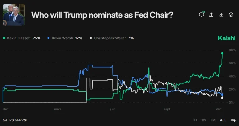 در همین حال، معاملهگران در پلتفرم کالشی احتمال ۷۵ درصدی را برای این موضوع در نظر گرفتهاند که کوین هَسِت، مدیر شورای ملی اقتصاد در کاخ سفید، بهعنوان رئیس جدید فدرال رزرو انتخاب شود.