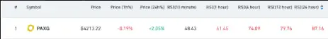قیمت رمزارز PAX Gold (PAXG) هماکنون در محدوده ۴,۲۱۳ دلار معامله میشود، در حالی که شاخص RSI آن به ۸۷.۱۶ رسیده است — سطحی که بهمراتب بالاتر از محدوده معمول اشباع خرید محسوب میشود.