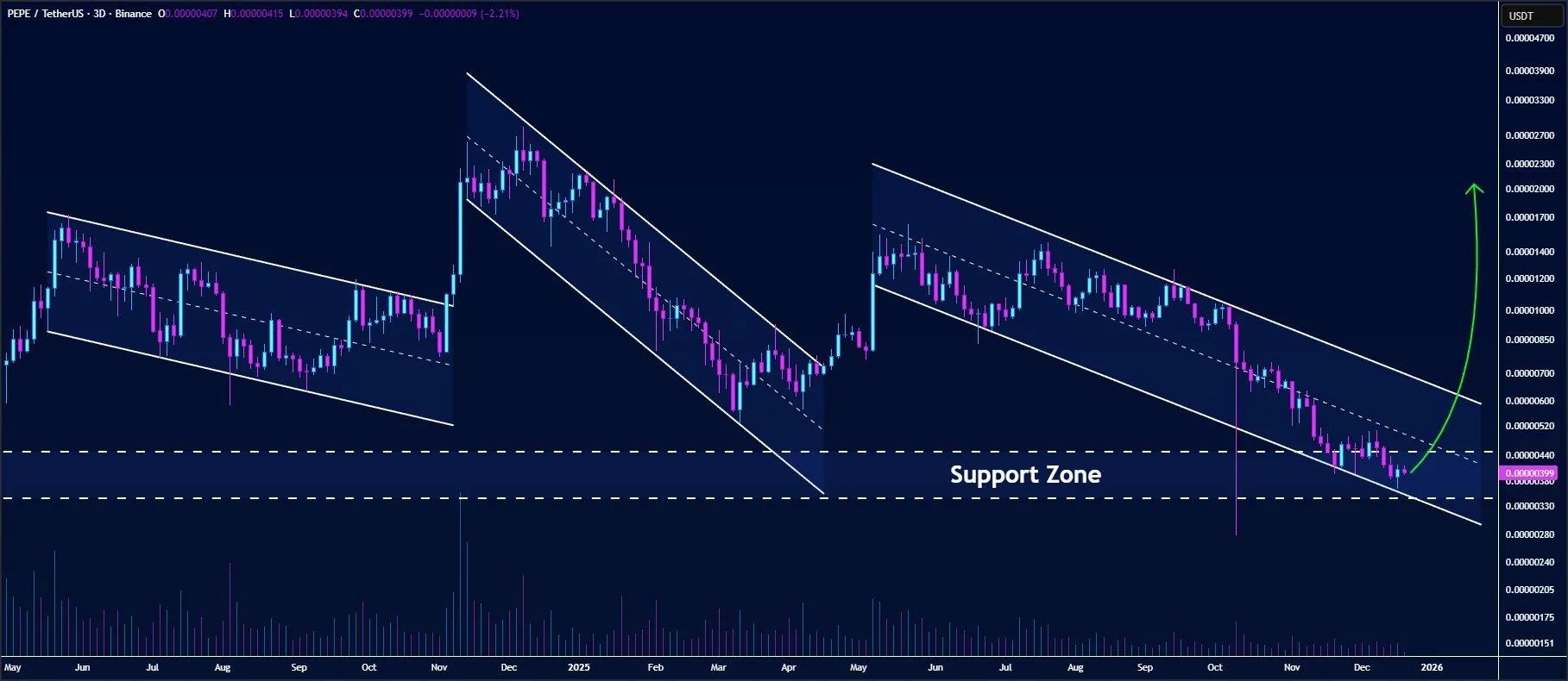 در حال حاضر، PEPE دقیقاً در نزدیکی یک ناحیه حمایتی مهم معامله میشود؛ محدودهای که در گذشته بارها مانع از ریزش عمیقتر قیمت شده و واکنش خریداران را به همراه داشته است. کاهش تدریجی فشار فروش در این ناحیه، توجه تحلیلگران تکنیکال را دوباره به این میمکوین جلب کرده است.