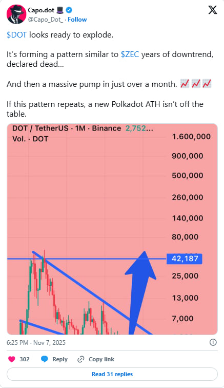 تحلیلگر معروف، Capo، در شبکه X اعلام کرده است که الگوی حرکتی پولکادات شباهتهایی به ZCash دارد و احتمال حرکت پارابولیک و ثبت رکورد جدید برای DOT دور از انتظار نیست.