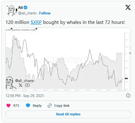 ریپل در تلاش است تا پس از یک هفته قدرتمند از انباشت توسط دارندگان بزرگ، از مرز ۳ دلار عبور کند. دادههای تحلیلگر علی مارتینز نشان میدهد که نهنگها طی ۷۲ ساعت گذشته ۱۲۰ میلیون XRP خریداری کردهاند؛ موضوعی که نشاندهنده اعتماد سرمایهگذاران بزرگ به این دارایی، علیرغم هشدارهای تکنیکال، است.