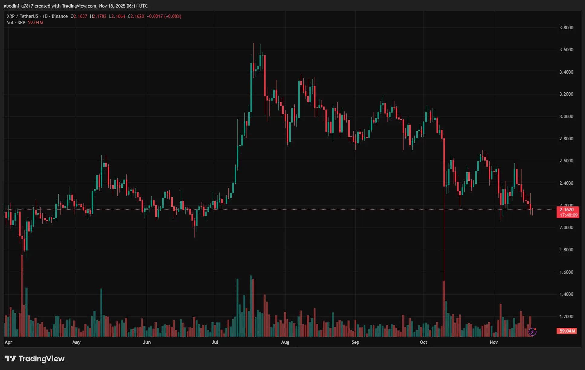 ریپل تحت فشار شدید قرار دارد. XRP اکنون پس از افت ۵ درصدی در ۲۴ ساعت گذشته، حوالی ۲.۱۵ دلار معامله میشود و حدود ۴۰ درصد پایینتر از اوج ۳.۶۵ دلاری ماه ژوئیه قرار دارد.