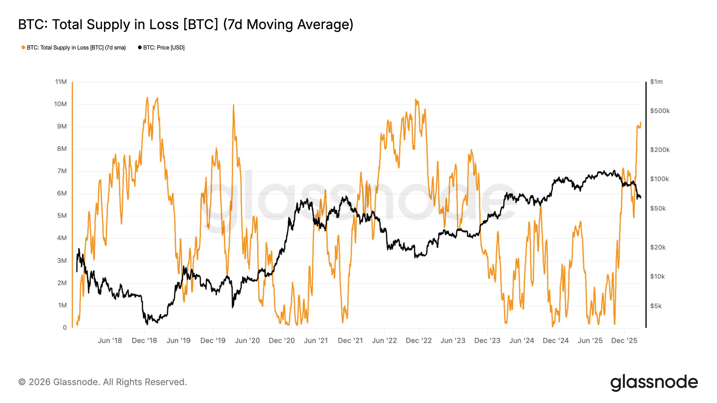 حدود ۹.۲ میلیون بیتکوین در حال حاضر در ضرر نگهداری میشود و نسبت سود به زیان تحققیافته ۹۰ روزه به زیر ۱ سقوط کرده است. یعنی تعداد فروشندگان در ضرر از فروشندگان در سود بیشتر شده است.