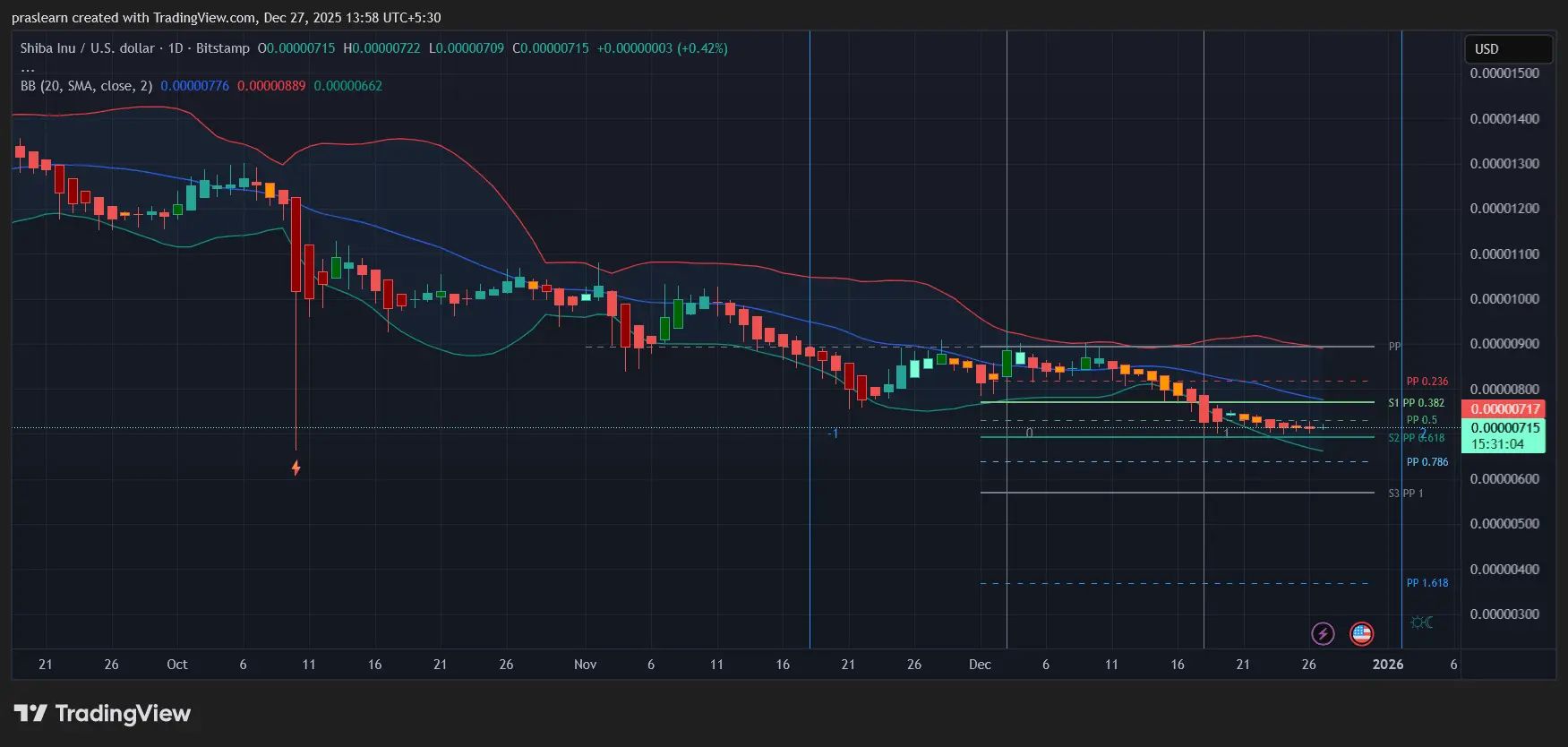 بررسی نمودار روزانه در تریدینگویو نشان میدهد قیمت شیبا اینو در محدوده ۰.۰۰۰۰۰۷۱۵ دلار در حال نوسان است؛ جایی نزدیک به باند پایینی بولینگر و پایینتر از میانگین متحرک ساده ۲۰ روزه. این ترکیب معمولاً نشانهای از ضعف مومنتوم و ادامه فشار فروش است.