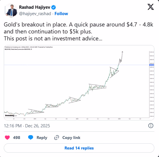 علاوه بر نقره، طلا نیز مسیر صعودی خود را ادامه میدهد و اخیراً قیمت آن برای اولین بار از مرز ۴۵۰۰ دلار عبور کرده است. حاجییف پیشبینی کرده که طلا ممکن است به محدوده ۴۷۰۰ تا ۴۸۰۰ دلار برسد و در ادامه حتی مرز ۵۰۰۰ دلار را تجربه کند. این روند صعودی برای سرمایهگذاران نشاندهنده جذابیت فلزات گرانبها در سال پیش رو است.