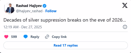 حاجییف در یک تحلیل مفصل در شبکههای اجتماعی توضیح داده که نقره از الگوی ۴۵ ساله «فنجان و دسته» عبور کرده و این حرکت میتواند به صعودی چشمگیر قیمت در سال آینده منجر شود. او تاکید کرد که آغاز روند صعودی ممکن است از اواخر ۲۰۲۵ شروع شود و سرمایهگذاران باید آماده حرکت بعدی باشند.