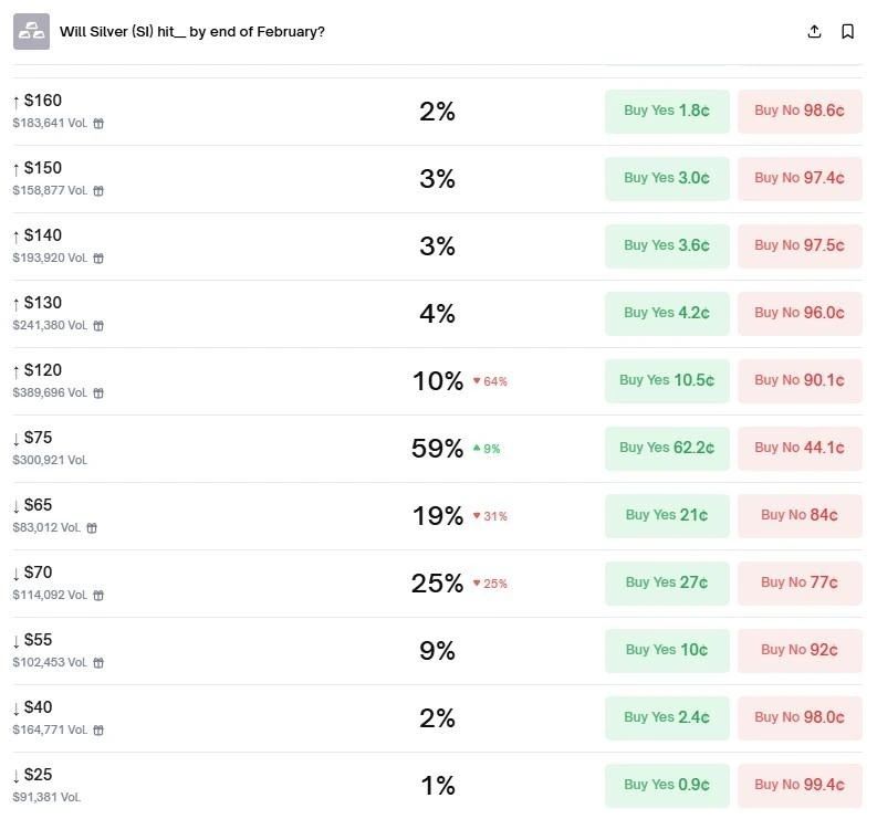 بر اساس دادههایی که Finbold از Polymarket استخراج کرده، محتملترین سناریو این است که نقره در مقطعی از ماه سطح ۷۵ دلار را لمس کند؛ احتمالی که ۵۹ درصد برآورد شده است.