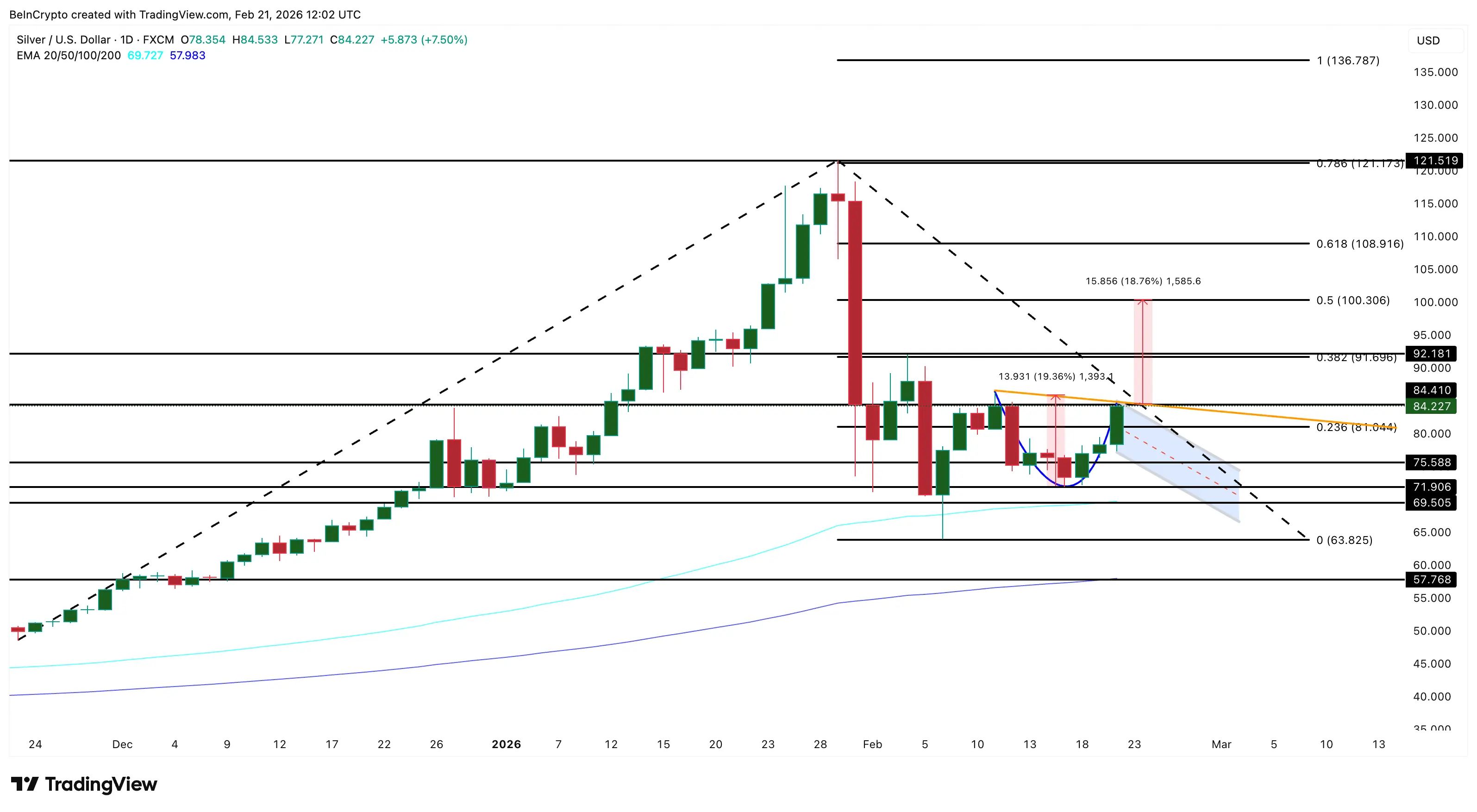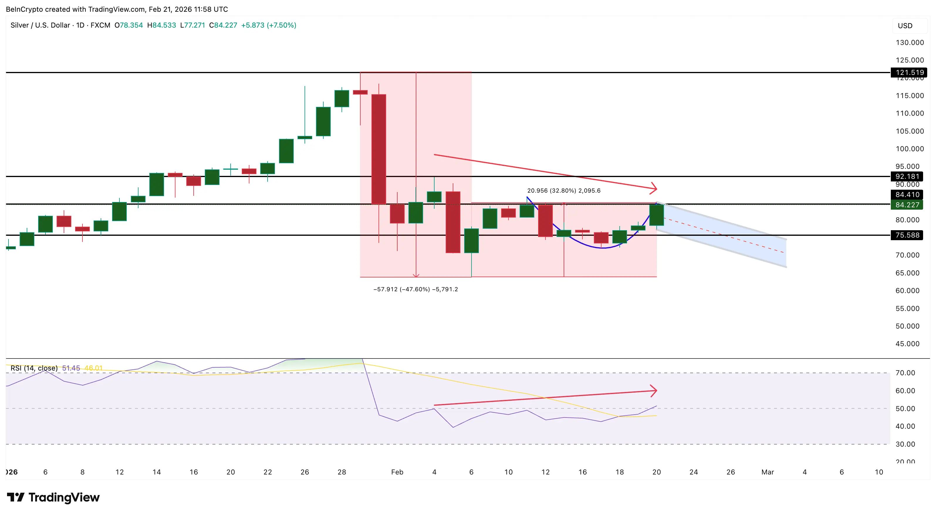 بررسی نمودار روزانه XAG/USD نشان میدهد ساختاری شبیه الگوی فنجان در حال شکلگیری است. موج صعودی از نوامبر ۲۰۲۵ آغاز شد، در ژانویه به اوج رسید و سپس اصلاح عمیقی را تجربه کرد. بازیابی اخیر قیمت، نقره را به محدوده خط گردن این الگو رسانده است، اما همزمان نشانههایی از مکث بازار دیده میشود. در بازه اوایل فوریه تا ۲۰ فوریه، قیمت سقف پایینتر ساخته، در حالی که شاخص RSI سقف بالاتری ثبت کرده است. این واگرایی پنهان نزولی معمولاً بیانگر نیاز بازار به تثبیت پیش از حرکت بعدی است و تا زمانی معتبر خواهد بود که قیمت زیر محدوده ۹۲ دلار باقی بماند.
