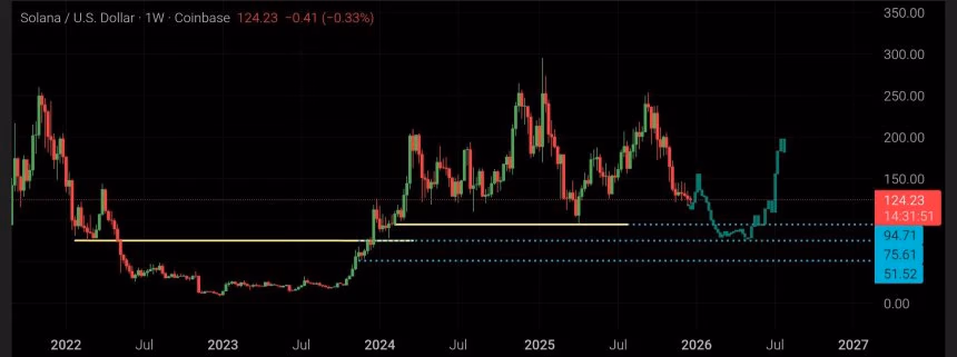 بر اساس تحلیل Elite Crypto، سولانا در تایمفریم بلندمدت نشانههای ضعف جدی دارد و ممکن است یک الگوی سر و شانه چندساله در حال شکلگیری باشد. خط گردن این الگو حوالی ۱۰۵ دلار قرار دارد و از دست رفتن این حمایت میتواند مسیر قیمت را تا محدوده ۷۵–۵۱ دلار باز کند. این مرحله احتمالاً تا نیمه ۲۰۲۶ ادامه خواهد داشت و پس از آن روند کلی سولانا میتواند صعودی شود.
