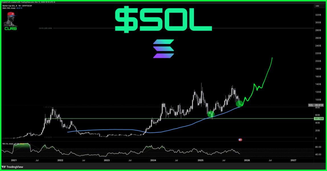 به گفتهی تحلیلگران در شبکه X، سطح ارزش بازار ۸۰ میلیارد دلاری (همتراز با میانگین متحرک ۱۰۰ هفتهای) بهعنوان منطقهی حمایتی حیاتی سولانا شناخته میشود. در صورتی که سولانا بتواند این سطح را حفظ کند، احتمال صعود تا محدودهی ۱۰۰۰ دلار در ۳ تا ۶ ماه آینده وجود دارد.