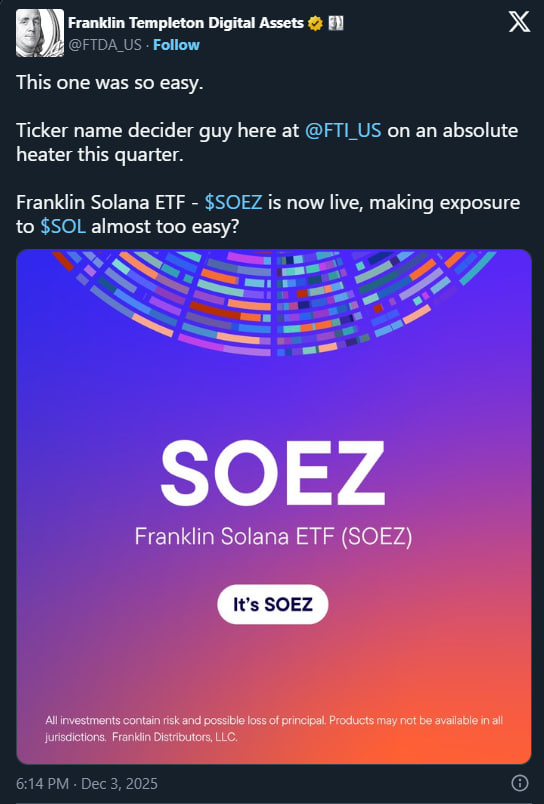 فقط در چند ساعت، توجه بازار رمزارزها به سمت خبر تازهای چرخید: فرانکلین تمپلتون با مدیریت دارایی ۱.۶۹ تریلیون دلار، یک ETF جدید برای سولانا با تیکر بحثبرانگیز SOEZ معرفی کرد و همین نام کافی بود تا موجی تازه در میان معاملهگران ایجاد شود.