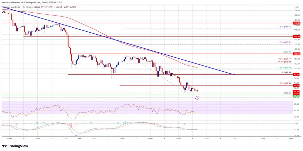 قیمت سولانا پس از ناکامی در تثبیت بالای ۱۰۲ دلار، وارد یک موج نزولی تازه شد. این افت باعث شد SOL ابتدا سطح روانی ۱۰۰ دلار و سپس حمایت ۹۵ دلار را از دست بدهد. فشار فروش با عبور قیمت از ۹۲ دلار تشدید شد و در نهایت کف موقت ۸۹ دلار به ثبت رسید.