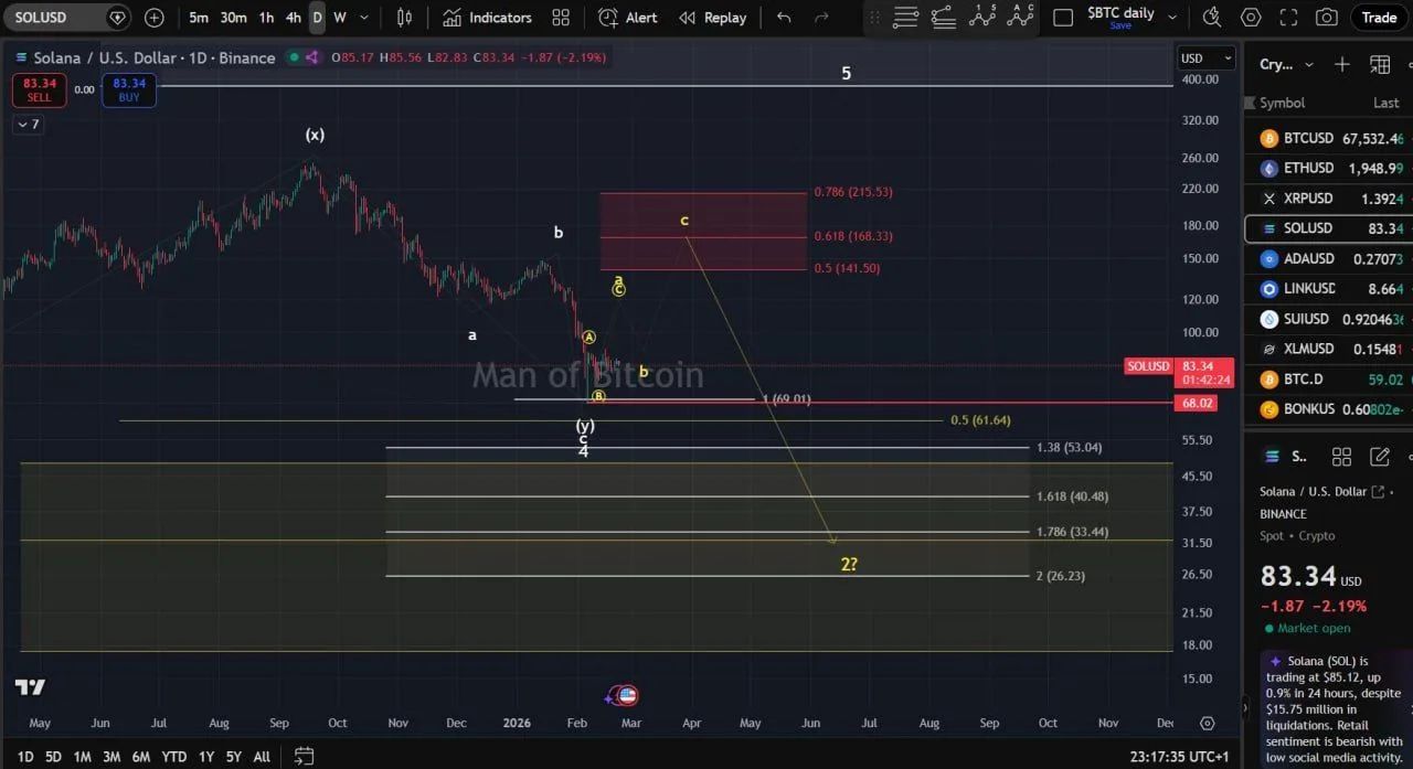 در نمودار روزانه SOLUSD، سطح ۶۸.۰۲ دلار بهعنوان حمایت کوتاهمدت در حال دفاع است. یک تحلیلگر مطرح بازار اعلام کرده تا زمانی که این سطح حفظ شود، سناریوی یک اصلاح ABC همچنان محتمل خواهد بود.
