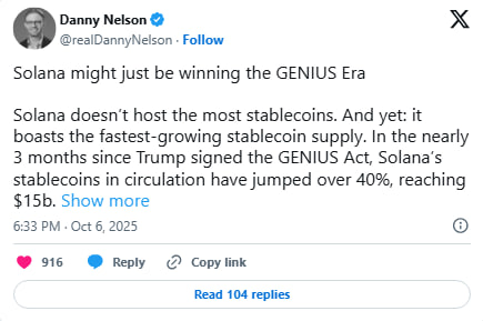 کارشناسان معتقدند رشد اخیر سولانا تا حدی نتیجهی اجرای قانون GENIUS است؛ قانونی که مسیر استفاده مؤسسات مالی از فناوریهای بلاکچینی را هموارتر کرده است.