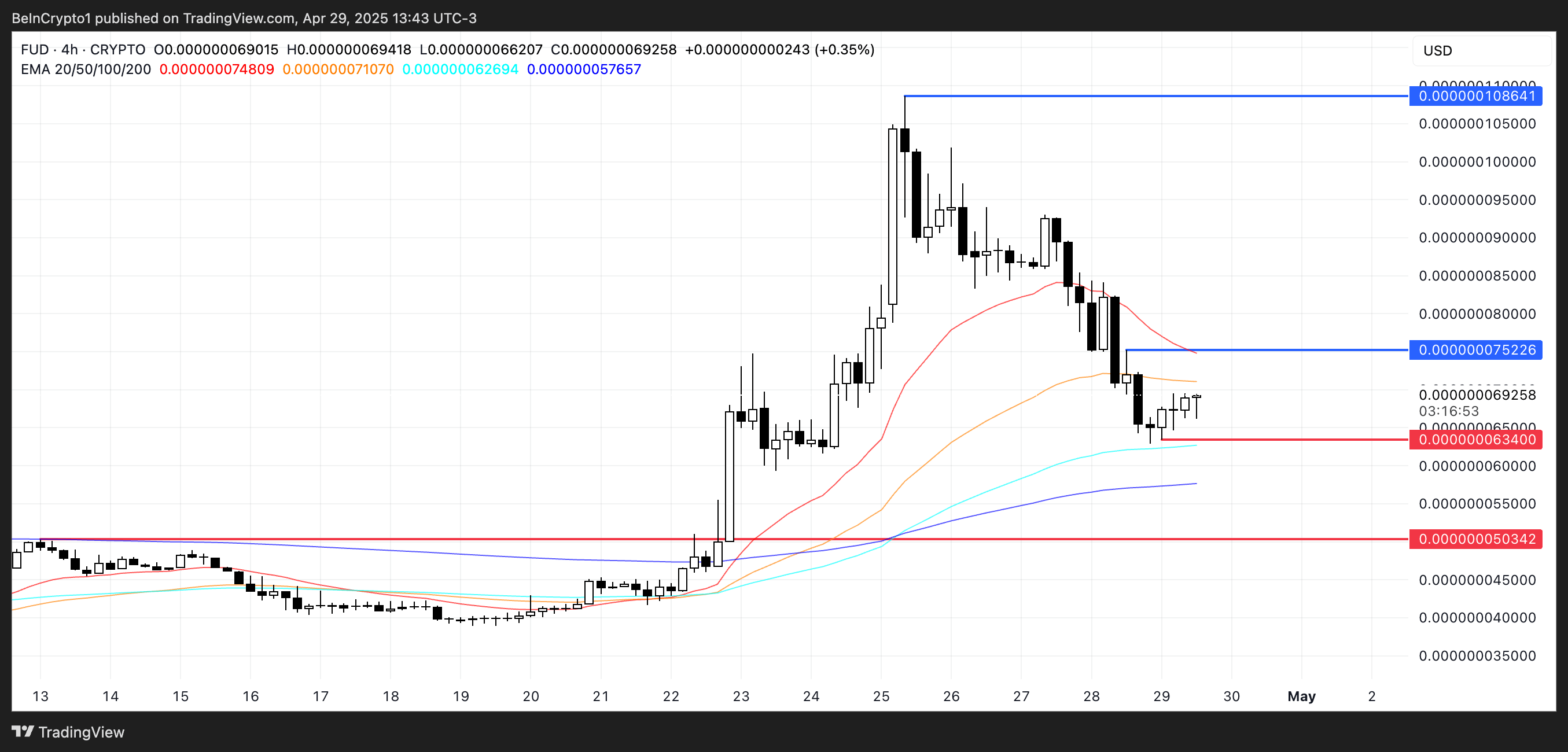 از نظر فنی، FUD اخیراً سطح حمایت ۰.۰۰۰۰۰۰۰۶۳۴ دلار را آزمایش کرده است. اگر این سطح شکسته شود، هدف نزولی بعدی میتواند ۰.۰۰۰۰۰۰۰۵۰ دلار باشد.