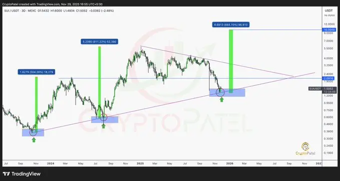 از منظر تکنیکال، الگوی قیمتی که یکی از تحلیلگران بهاشتراک گذاشته، قابلتوجه است. در این تحلیل نشان داده شده هر بار که قیمت SUI به نواحی حمایتی اصلی خود رسیده، پس از آن رشد شارپی را تجربه کرده است. برای نمونه، در سال ۲۰۲۳ یک رشد حدود ۴۵۰ درصدی ثبت شد، در سال ۲۰۲۴ حدود ۷۵۰ درصد رالی مشاهده شد و حالا در ۲۰۲۵ نیز قیمت یکبار دیگر این سطح حمایتی را لمس کرده است.
