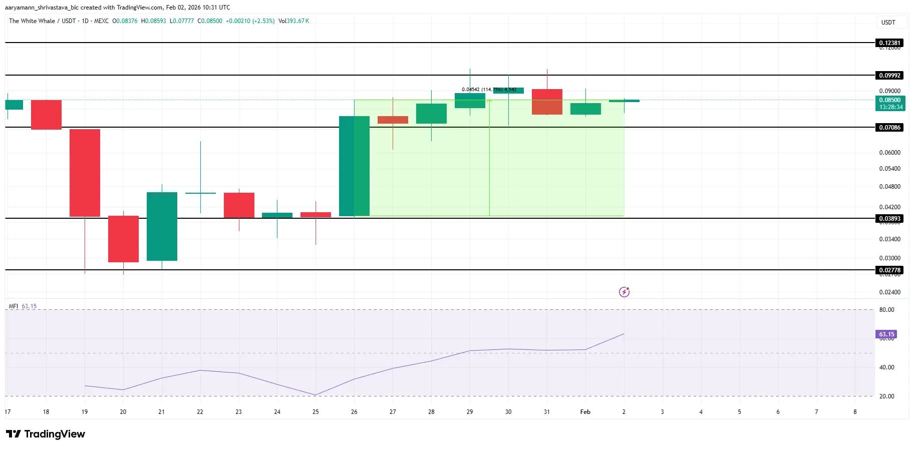 این دوره تثبیت میتواند نشانه یک بازتنظیم سالم باشد، نه پایان روند صعودی. شاخص جریان پول همچنان در سطوح بالایی قرار دارد که حاکی از ادامه فشار خرید است. اگر تقاضا پایدار بماند، WHITEWHALE میتواند مقاومت ۰.۰۹۹ دلار را بشکند.