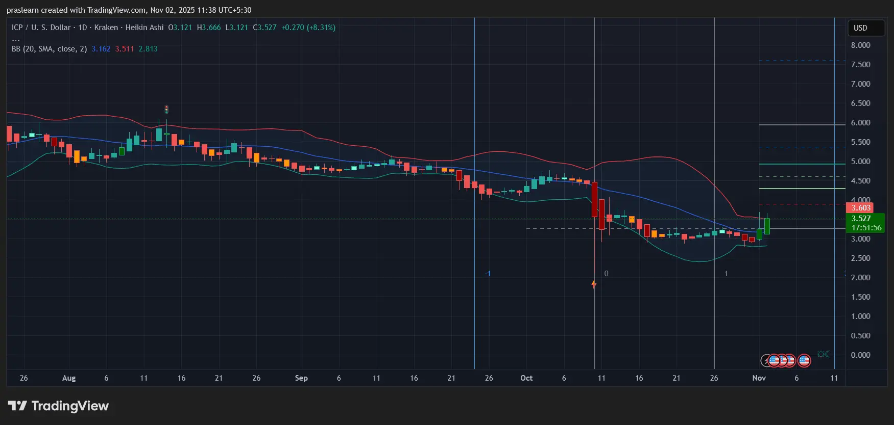 در میان این سه ارز، ICP از نظر فنی صعودی‌ترین وضعیت را دارد. پس از چندین هفته کاهش، قیمت آن تنها در یک روز بیش از ۸ درصد رشد کرد و در محدوده ۳.۵۲ دلار بسته شد. این جهش باعث شد قیمت دوباره بالاتر از خط میانی باند بولینگر قرار گیرد که نشانه‌ای از بازگشت قدرت خریداران است.