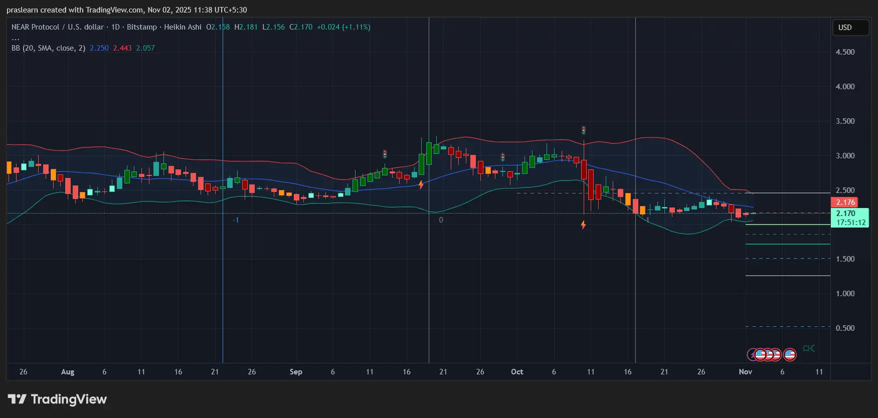 قیمت NEAR در محدوده حدود ۲.۱۷ دلار در حال معامله است و پس از افت تند ماه اکتبر، نشانه‌هایی از ثبات و تثبیت را نشان می‌دهد. باندهای بولینگر در نمودار روزانه فشرده شده‌اند که بیانگر کاهش نوسان و احتمال وقوع یک حرکت انفجاری در آینده نزدیک است. قیمت اکنون اندکی زیر خط میانی (حدود ۲.۲۵ دلار) قرار دارد که نشانه‌ای از فاز تجمیع کوتاه‌مدت است.