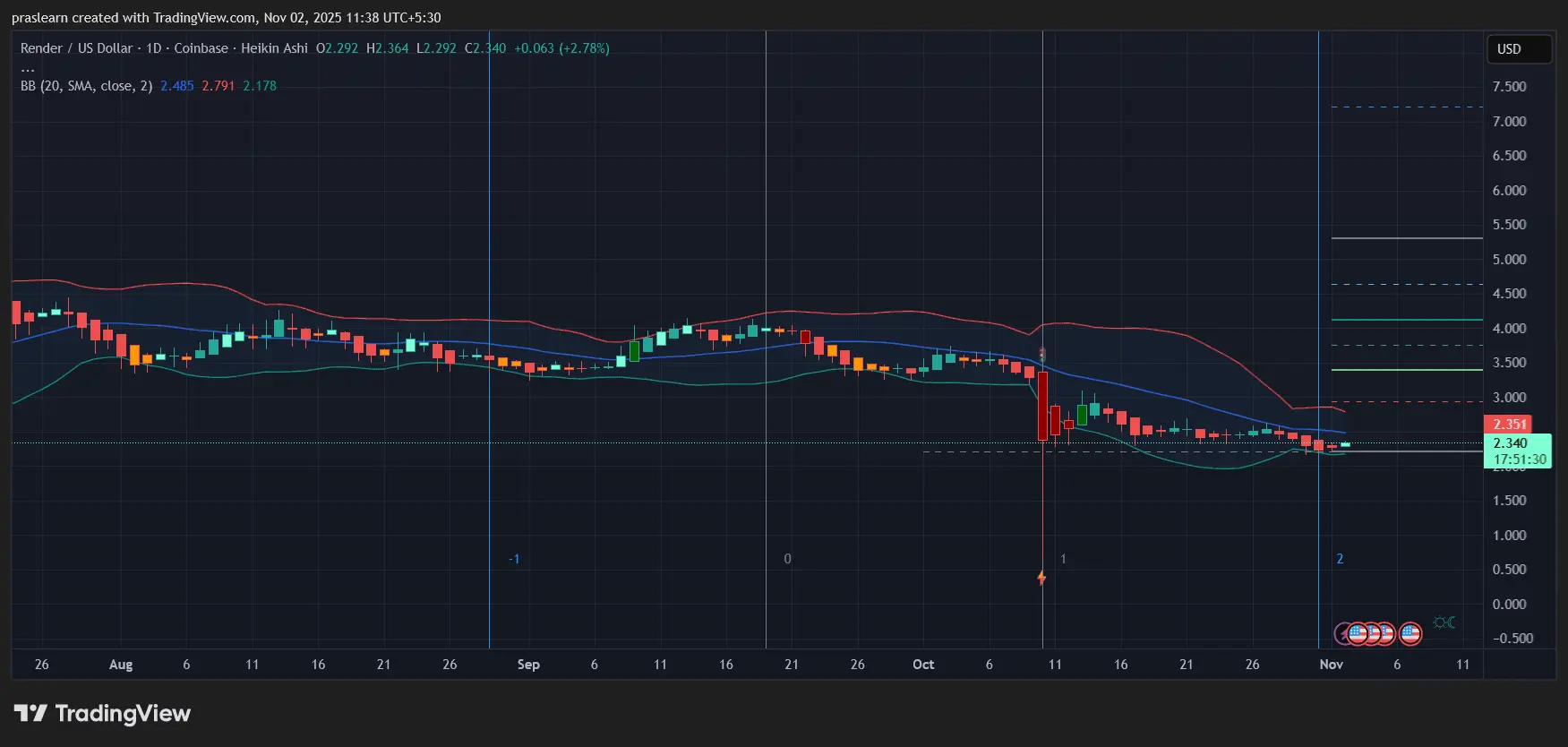 قیمت Render در حال حاضر نزدیک به ۲.۳۴ دلار است و پس از چند هفته تثبیت، نشانه‌هایی از بهبود آهسته را نشان می‌دهد. این ارز برای مدتی طولانی زیر خط میانی باند بولینگر قرار داشت که بیانگر فاز انباشت سنگین است. اما شمع سبز جدید و چرخش رو به بالای باند پایینی، نشانه‌ای از تشکیل کف احتمالی در محدوده ۲.۱۰ دلار است.