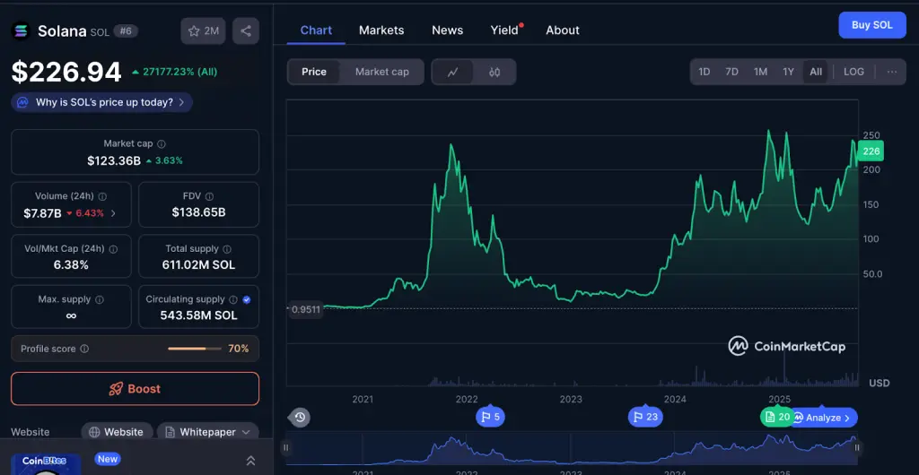 البته ریسکهایی همچون نگرانی از تمرکزگرایی و مسائل مربوط به پایداری شبکه همچنان وجود دارد، اما ارتقاهای متعددی در جریان است. اگر مسیر توسعه بهدرستی پیش برود، SOL میتواند به اوجهای قبلی خود بازگردد و حتی فراتر رود. در حال حاضر سولانا حدود ۲۲۵ دلار معامله میشود که تنها ۲۵ دلار کمتر از اوج تاریخی آن در محدوده ۲۵۰ دلار است.