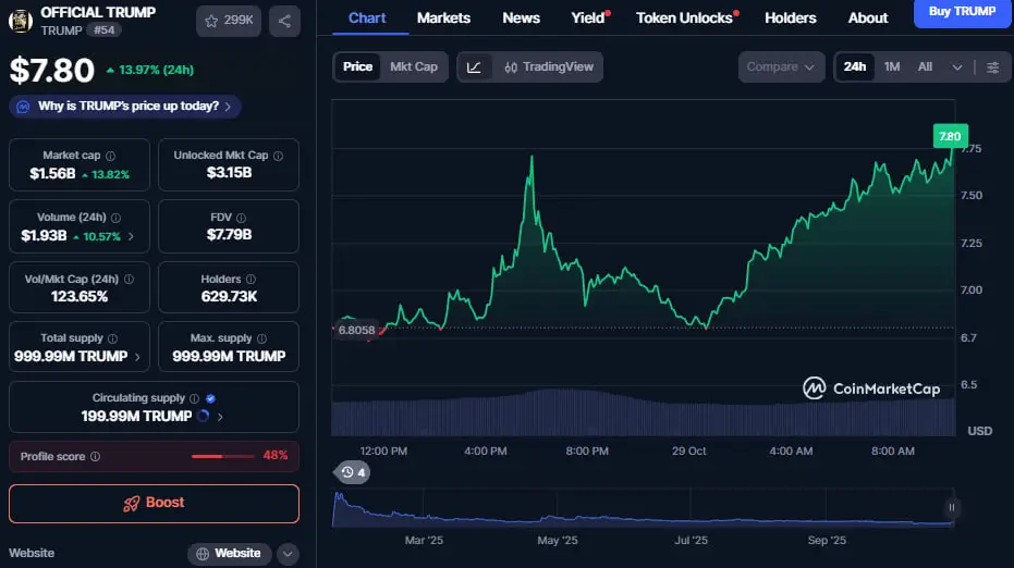 ارز دیجیتال «ترامپ رسمی» (TRUMP) دوباره به صدر اخبار بازگشته است. این توکن با جهشی نزدیک به ۱۰ درصد در یک روز، اکنون حدود ۷.۵۳ دلار معامله میشود و برخلاف افت کلی بازار ارزهای دیجیتال، روندی صعودی در پیش گرفته است. این رشد ناگهانی نشان میدهد که توکنهای سیاسی میتوانند در زمان همراستایی سرمایهگذاران بزرگ و سیگنالهای تکنیکال، توجه زیادی را به خود جلب کنند.
