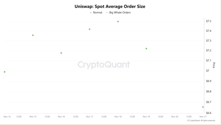 یک نهنگ در ۱۱ نوامبر ۱.۷ میلیون UNI به ارزش ۱۵ میلیون دلار فروخت که بخش عمده آن بین فوریه تا اکتبر جمعآوری شده بود. حتی پس از چند ماه نگهداری، این معامله حدود ۱.۴ میلیون دلار ضرر داشت. این نوع فروش پس از افزایش ناگهانی قیمت، نمونهای کلاسیک از فروش ترسمحور است که معمولاً در مراحل عمیقتر بازار نزولی دیده میشود.