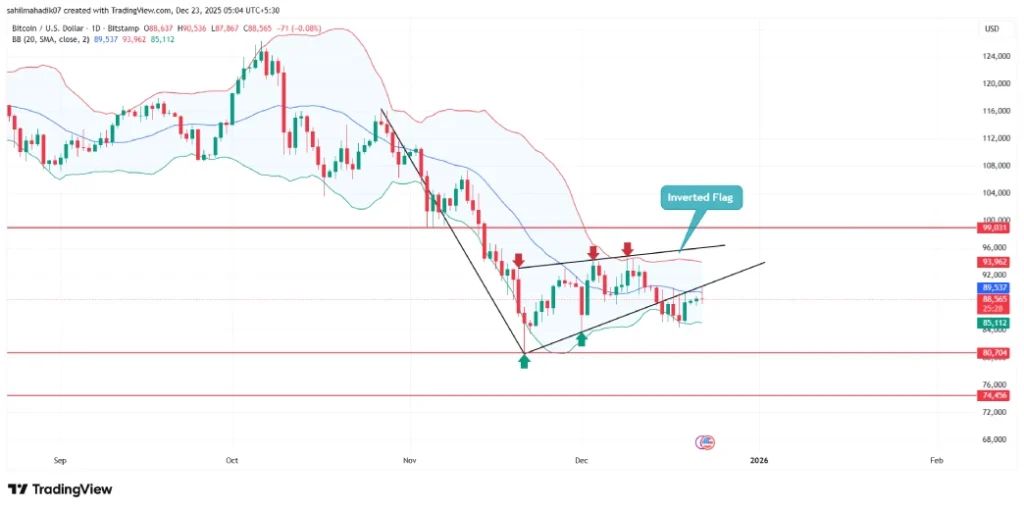 در بازه زمانی اواخر نوامبر تا اواسط دسامبر، قیمت بیتکوین در یک حرکت موقت بین دو خط روند همگرا در الگوی پرچم معکوس نوسان داشت. این الگو معمولاً در دل یک روند نزولی شکل میگیرد و اغلب نشاندهنده تخلیه موقت فشار فروش است.