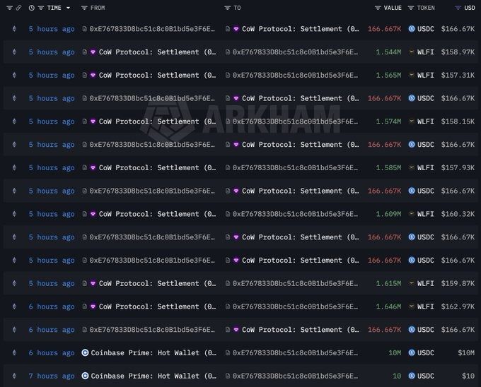 یکی از مهمترین محرکهای این رشد، خرید قابل توجه یک سرمایهگذار بزرگ بوده است. دادههای پلتفرم تحلیلی Lookonchain نشان میدهد یک کیف پول جدید با تزریق ۱۰ میلیون دلار USDC ایجاد شده و بلافاصله برای خرید توکن WLFI وارد عمل شده است.