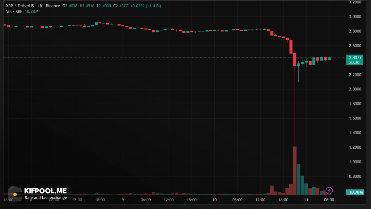 طبق دادههای بازار، قیمت XRP از سطح ۲.۸۲ دلار تا ۲.۳۶ دلار بین تاریخهای ۱۰ تا ۱۱ اکتبر کاهش یافت و در این بازه ۲۴ ساعته، افتی معادل ۱۶ درصد را ثبت کرد. نوسانات درونروزی (Intraday Volatility) نیز به اوج ۴۳ درصد رسید و قیمت برای لحظاتی تا کف ۱.۶۴ دلار سقوط کرد.