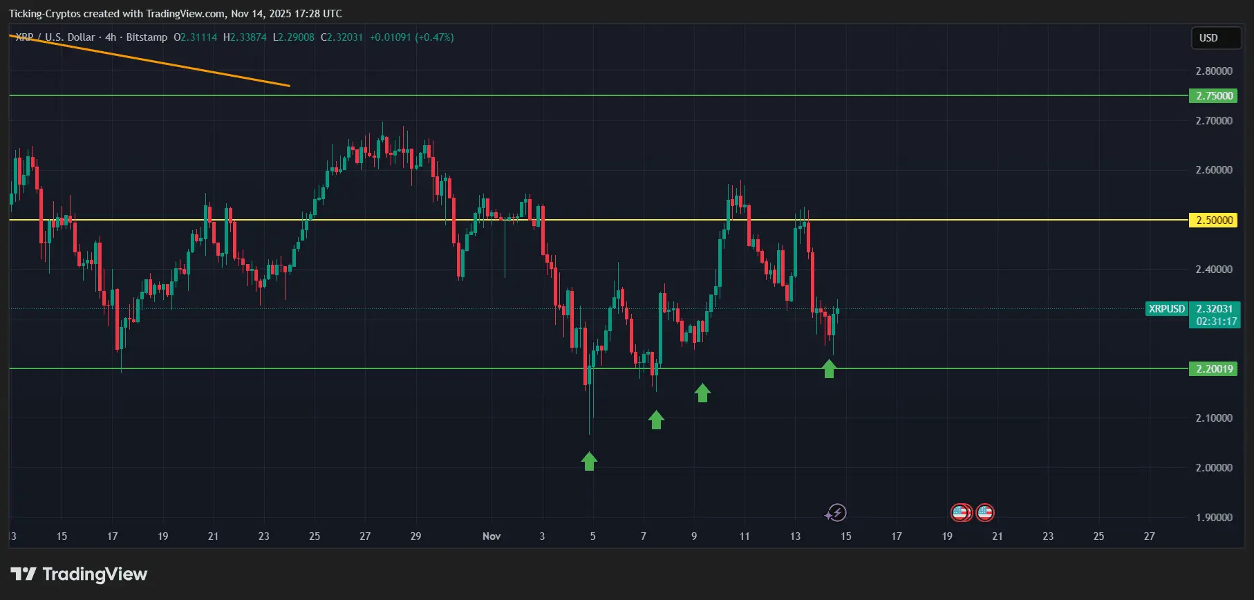 در این مدت چندین «فیکاوت» نیز رخ داده؛ بهطوری که قیمت برای مدت کوتاهی به زیر ۲.۲۰ دلار نفوذ کرده اما خیلی سریع به بالای آن بازگشته، که نشان میدهد خریداران با قدرت از این سطح دفاع کردهاند.