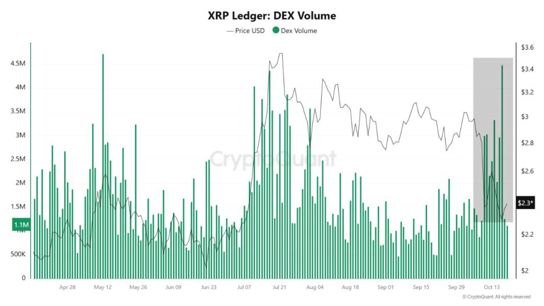 بر اساس دادههای CryptoQuant و تحلیل کریپتوآنچین، بین ۸ تا ۱۷ اکتبر، قیمت ریپل از حدود ۳ دلار به ۲.۳ دلار سقوط کرد، اما حجم معاملات در دفتر کل غیرمتمرکز XRP به بالاترین سطح چند ماه اخیر رسید. این افزایش چشمگیر، که در نمودارهای آنها به صورت منطقه خاکستری مشخص شده، نشان میدهد که در حالی که قیمت ضعیف شده، فعالیت در زنجیره همچنان پررنگ است.