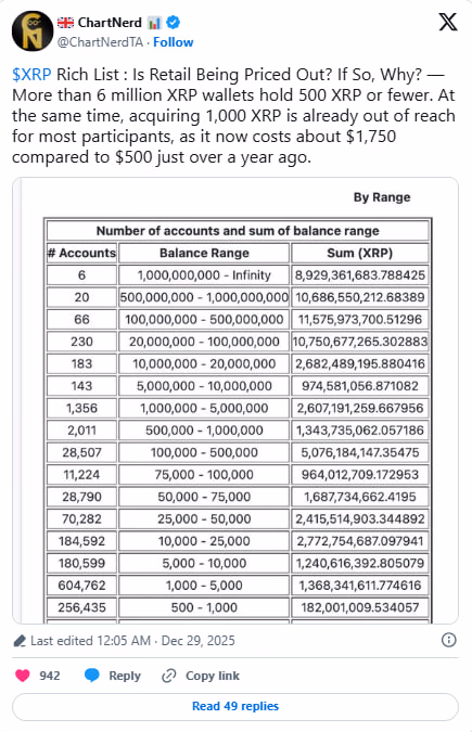 بیش از ۶ میلیون کیف پول ریپل کمتر از ۵۰۰ واحد این ارز را در اختیار دارند و همزمان چند کیف پول بزرگ بخش عمدهای از بازار را کنترل میکنند. این دادهها نگرانی تازهای در میان سرمایهگذاران خرد ایجاد کرده است: آیا خرید XRP برای افراد عادی سختتر شده است؟