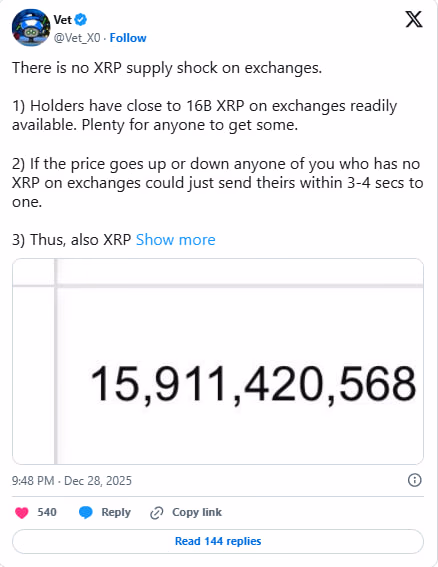 با این حال، برخی کاربران معتقدند که بازار با کمبود عرضه مواجه نیست. حدود ۱۶ میلیارد XRP هنوز در صرافیها موجود است و دارندگان میتوانند در صورت نیاز، توکنهای خود را به سرعت معامله کنند. همچنین، نوسانات بازار نشان میدهد حتی خریدهای بزرگ چند میلیون دلاری گاهی نمیتوانند قیمتها را بهطور قابل توجهی تغییر دهند.