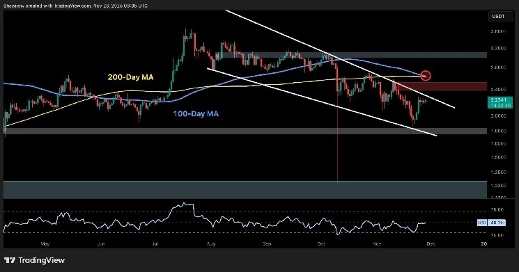 با این حال، مقاومت همپوشان مهم کمی بالاتر قرار دارد؛ زیرا قیمت باید ابتدا از مرز بالایی این الگو عبور کند تا بتواند به ناحیه ۲.۵۰ دلار برسد. حتی اگر این اتفاق رخ دهد، میانگینهای متحرک ۱۰۰ روزه و ۲۰۰ روزه همچنان در نزدیکی سطح ۲.۶۰ دلار بهعنوان مقاومت عمل خواهند کرد.