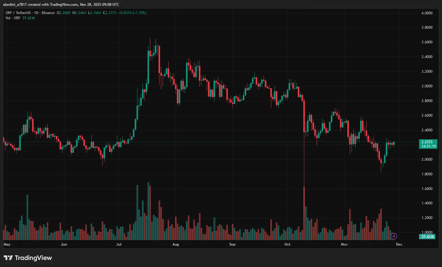 قیمت XRP در وضعیت عقبنشینی قرار دارد و حوالی ۲.۱۸ دلار معامله میشود؛ رقمی که نسبت به ۲۴ ساعت گذشته حدود ۱.۵۸ درصد کاهش نشان میدهد. اما پشت این اعداد قرمز، یک الگوی بسیار جالب وجود دارد که میتواند جهت حرکت قیمت را طی چند روز آینده مشخص کند.