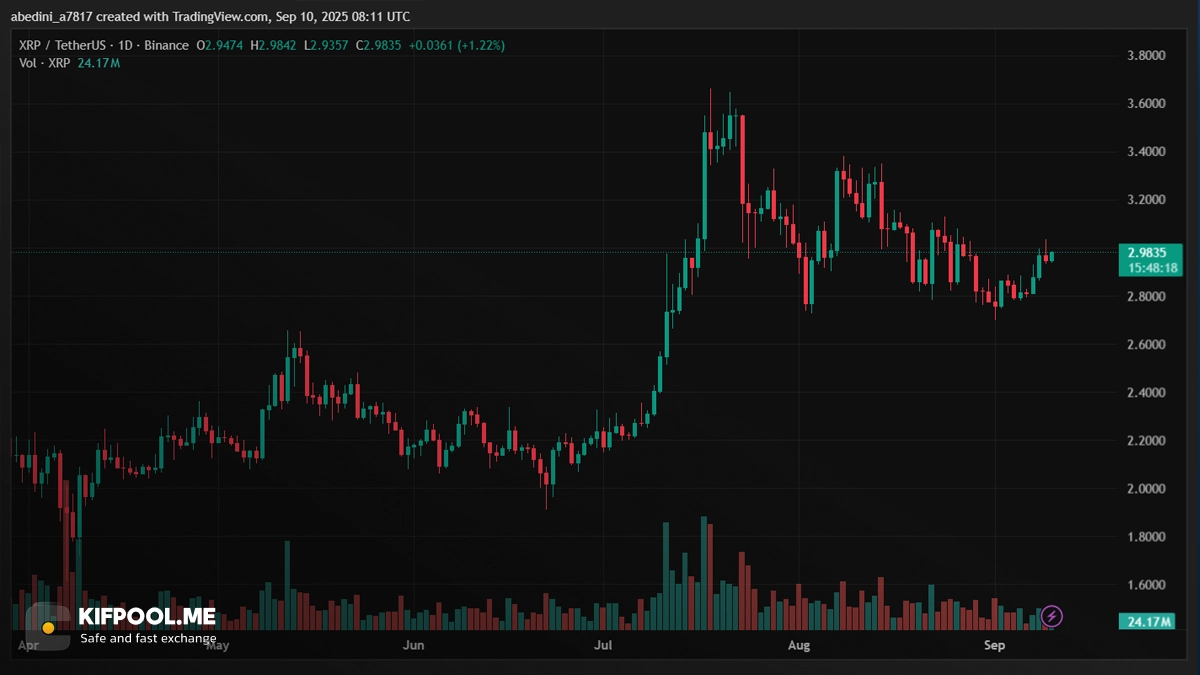 در نمودار ۴ ساعته، XRP بارها به خط نزولیای که از اواسط آگوست مانع رشد بوده فشار آورده است. مقاومت اصلی در بازه ۲.۹۸ تا ۳.۰۰ دلار قرار دارد. در صورت عبور موفق، اهداف ۳.۱۵ و ۳.۳۵ دلار قابل دستیابی خواهد بود. در سمت مقابل، حمایت کوتاهمدت بین ۲.۸۹ تا ۲.۹۲ دلار فعال است و در صورت شکست، احتمال سقوط به ناحیه ۲.۸۰ و حتی ۲.۷۰ دلار وجود دارد.