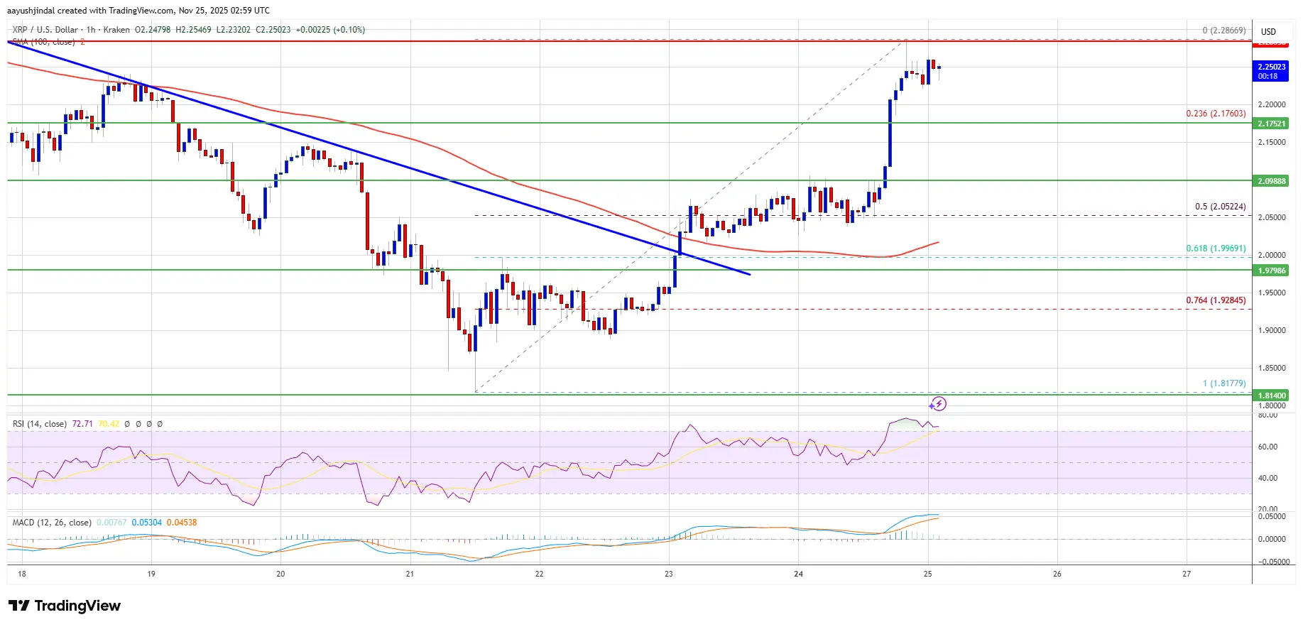 در نمودار ساعتی جفتارز XRP/USD (بر اساس دادههای Kraken)، شکست یک خط روند نزولی مهم با مقاومت ۲.۰۰ دلار نیز مشاهده شد که مسیر را برای رشد بیشتر باز کرد.