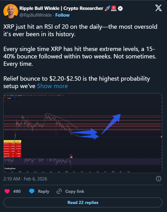 طبق دادههای بازار، شاخص قدرت نسبی یا RSI روزانه XRP در تاریخ ۵ فوریه به حدود عدد ۱۷ سقوط کرده است. این سطح از اشباع فروش، از نظر تکنیکال بسیار نادر محسوب میشود و آخرین بار بیش از یک دهه پیش مشاهده شده بود.