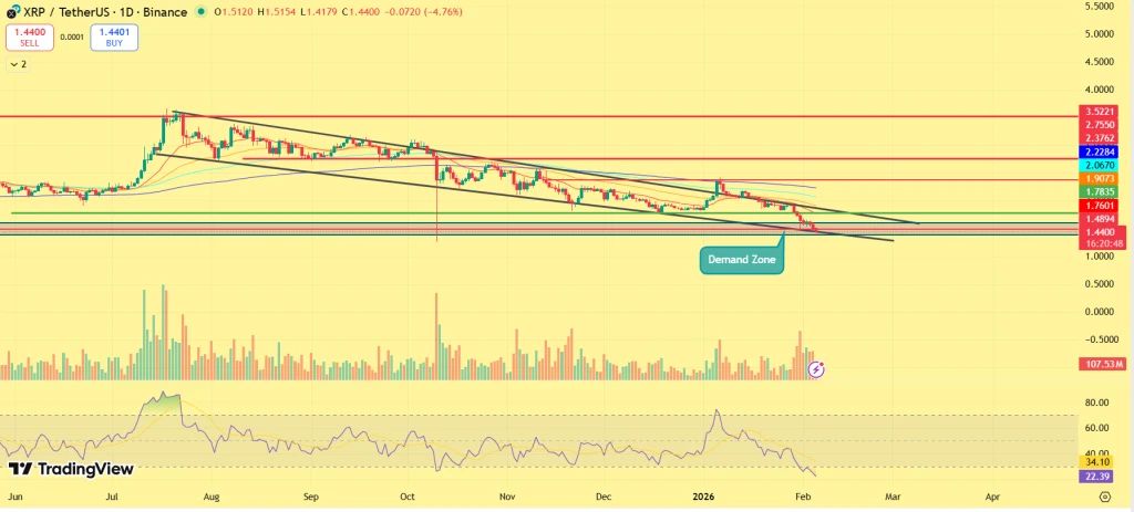 XRP طی ماههای اخیر در یک کانال نزولی گرفتار شده و ریزش اخیر قیمت آن را به نزدیک کف کانال رسانده است. قیمت پس از شکست میانگین کانال با شتاب کاهش یافت و کنترل کوتاهمدت بازار در دست فروشندگان قرار دارد.